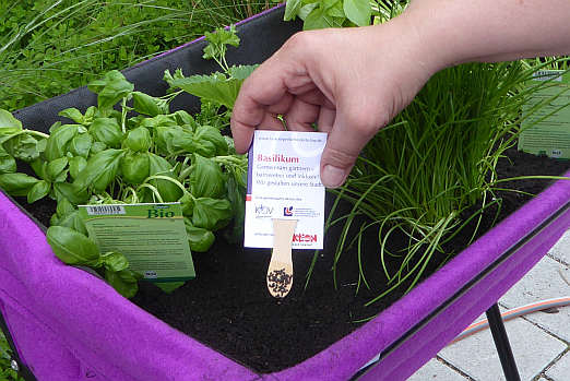 Inklusion schmeckt. Doch was wäre ein gemeinsames gärtnern ohne leckeres Essen aus der Kräuterküche? Schnell fand sich ein Küchenteam, das von – gekauftem – Basilikum geduldig Blatt für Blatt zupfte, um diese anschließend zu Pesto zu verarbeiten. Dabei wurden Rezepte ausgetauscht und über „Gott und die Welt“ gesprochen. Und wie schmeckt das handgemachte Basilikum-Pesto? „Himmlisch“, „… grad zum Reinlegen“, „wow“! ![]() Extra für den Aktionstag gab es Pflanzsticks mit Basilikum. Keine Frage, dass im Hochbeet ausreichend Platz für Basilikum vorhanden sein muss.